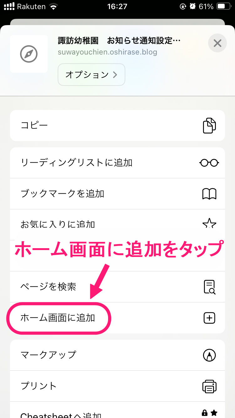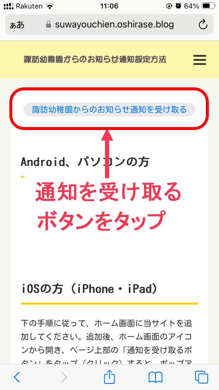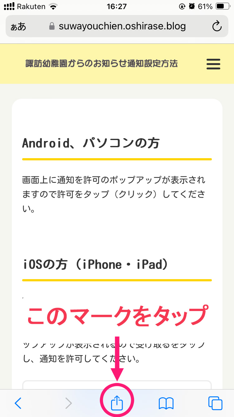 下の手順に従って、ホーム画面に当サイトを追加してください。追加後、ホーム画面のアイコンから開き、ページ上部の「通知を受け取るボタン」をタップすると、ポップアップが表示されますの許可するをタップしてください。※バージョン 16.4以降のSafariで通知を受けることができます。それより以前のバージョンには対応していません。