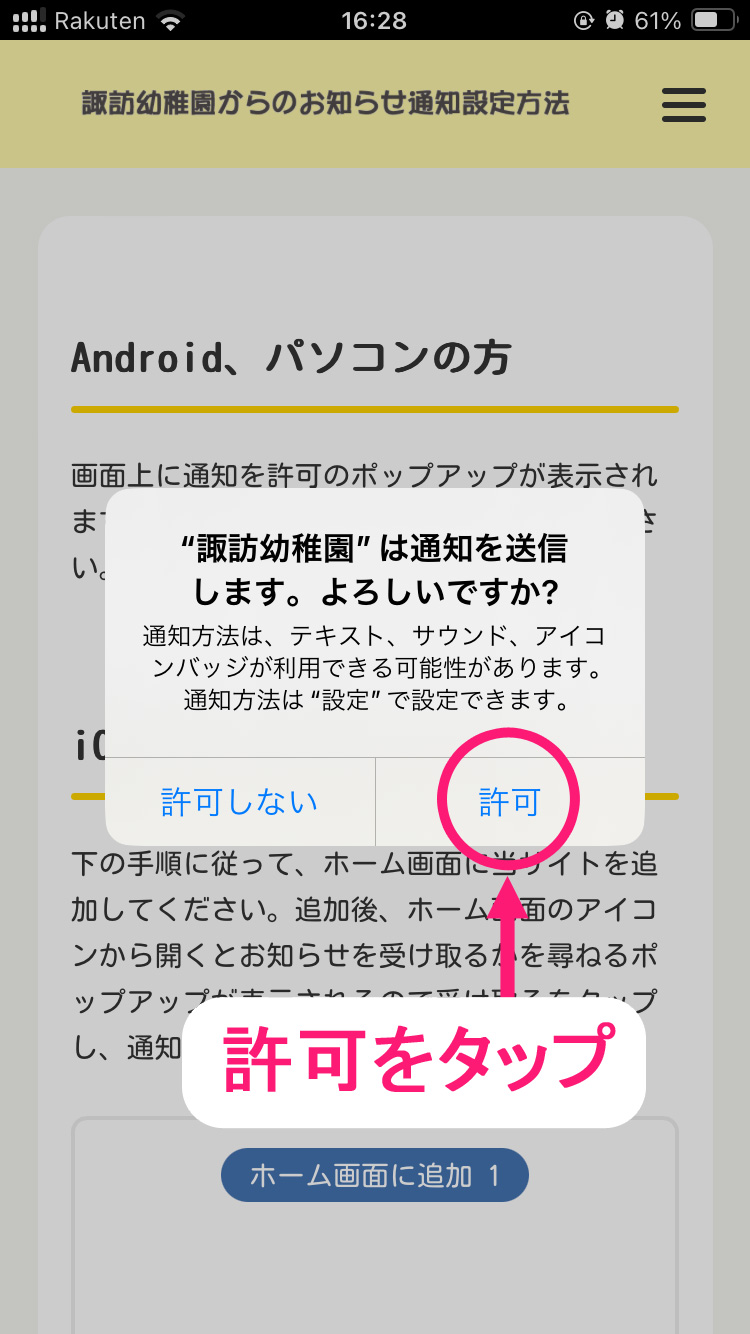 上の「通知を受け取るボタン」をタップ(クリック)すると、ポップアップが表示されますの許可するをタップ(クリック)してください。